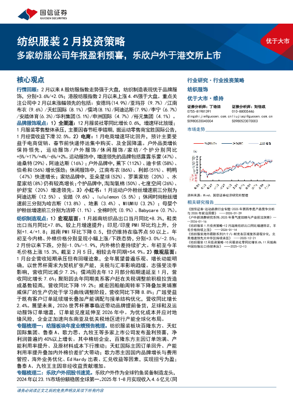 【国信证券】【202602】纺织服装 2月投资策略:多家纺服公司年报盈利预喜,乐欣户外于港交所上市-22页