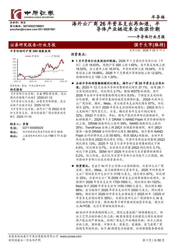 【中原证券】【202602】半导体行业月报:海外云厂商26年资本支出再加速,半导体产业链迎来全面涨价潮-50页