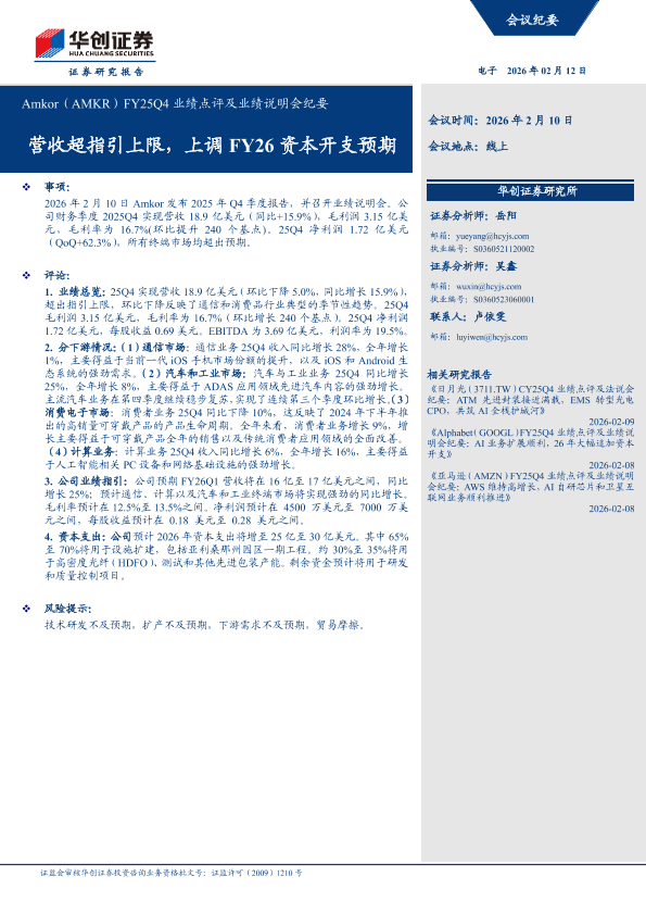 【华创证券】【202602】营收超指引上限,上调FY26资本开支预期:Amkor(AMKR)FY25Q4业绩点评及业绩说明会纪要-11页