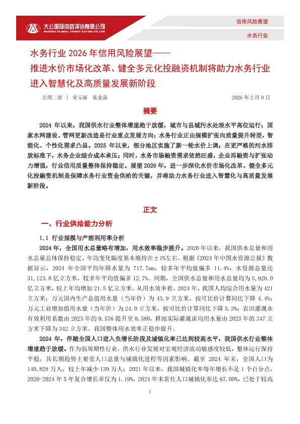 【大公国际】【202602】水务行业2026年信用风险展望——推进水价市场化改革、健全多元化投融资机制将助力水务行业进入智慧化及高质量发展新阶段-13页