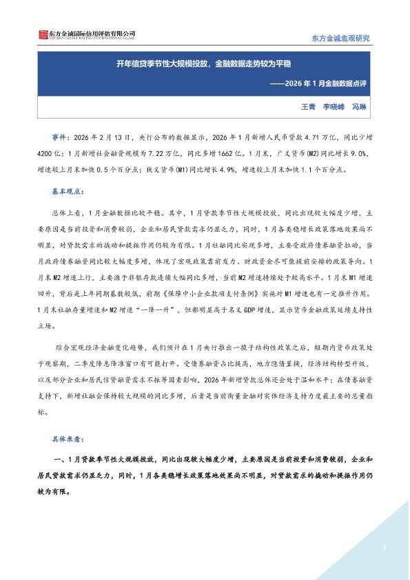 【东方金诚】【202602】开年信贷季节性大规模投放,金融数据走势较为平稳——2026年 1月金融数据点评-4页