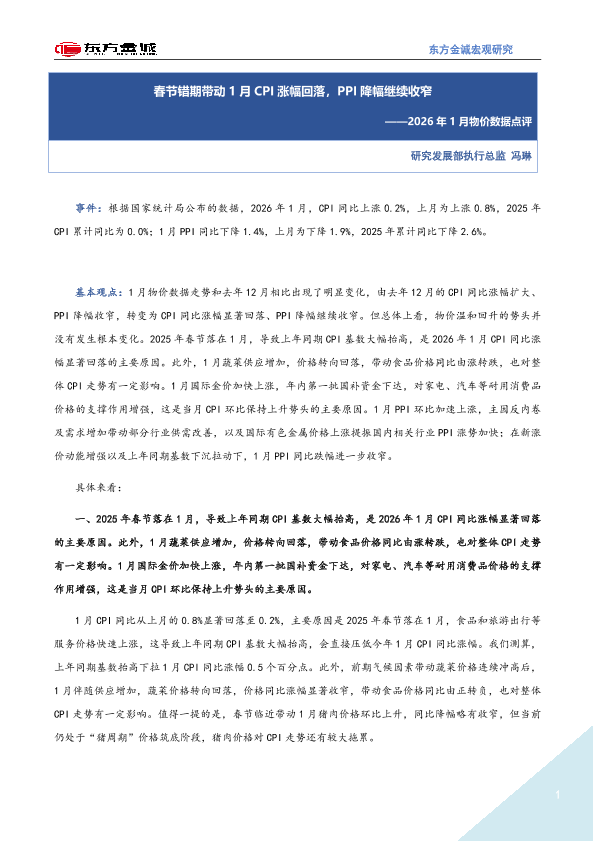 【东方金诚】【202601】2026年 1月物价数据点评——春节错期带动 1月 CPI涨幅回落,PPI降幅继续收窄-3页