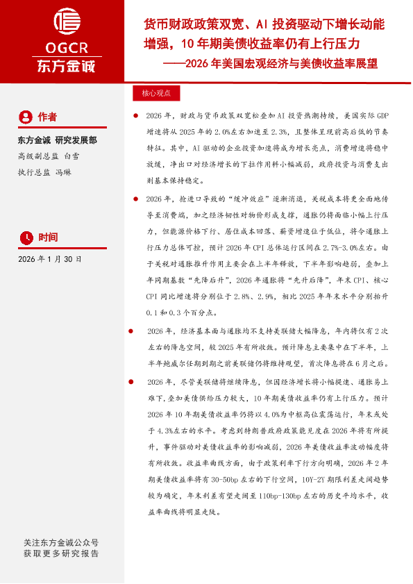 【东方金诚】【202601】2026年美国宏观经济与美债收益率展望——货币财政政策双宽、AI投资驱动下增长动能增强,10年期美债收益率仍有上行压力-29页