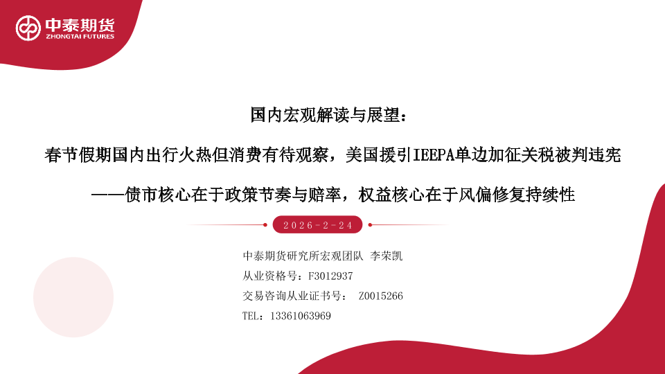 【中泰期货研究所】【202602】国内宏观解读与展望_春节假期国内出行火热但消费有待观察_美国援引IEEPA单边加征关税被判违宪——债市核心在于政策节奏与赔率_权益核心在于风偏修复持续性-64页
