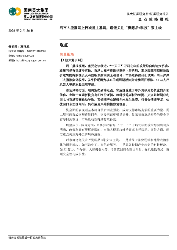 【英大证券】【202602】后市A股震荡上行或是主基调,逢低关注“资源品+科技”双主线-4页