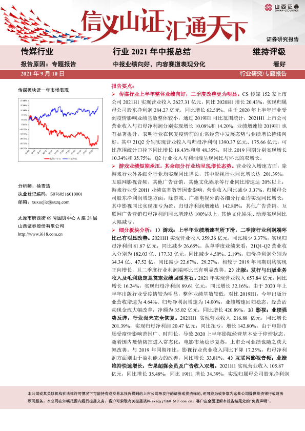 【山西证券】【20210910】传媒行业2021年中报总结:中报业绩向好,内容赛道表现分化-39页
