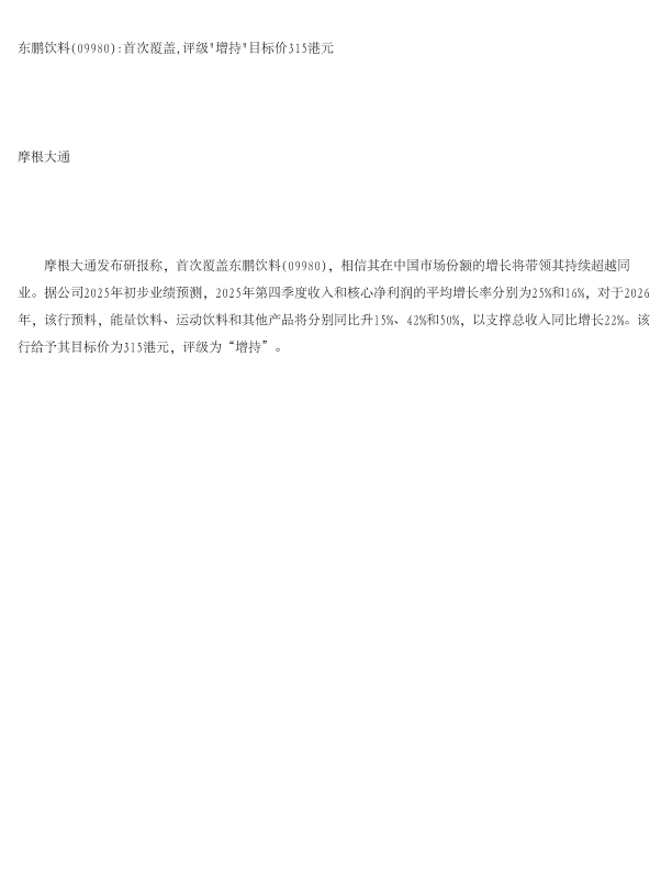 【J.P. Morgan】【2026】东鹏饮料(09980) 首次覆盖,评级"增持"目标价315港元-1页