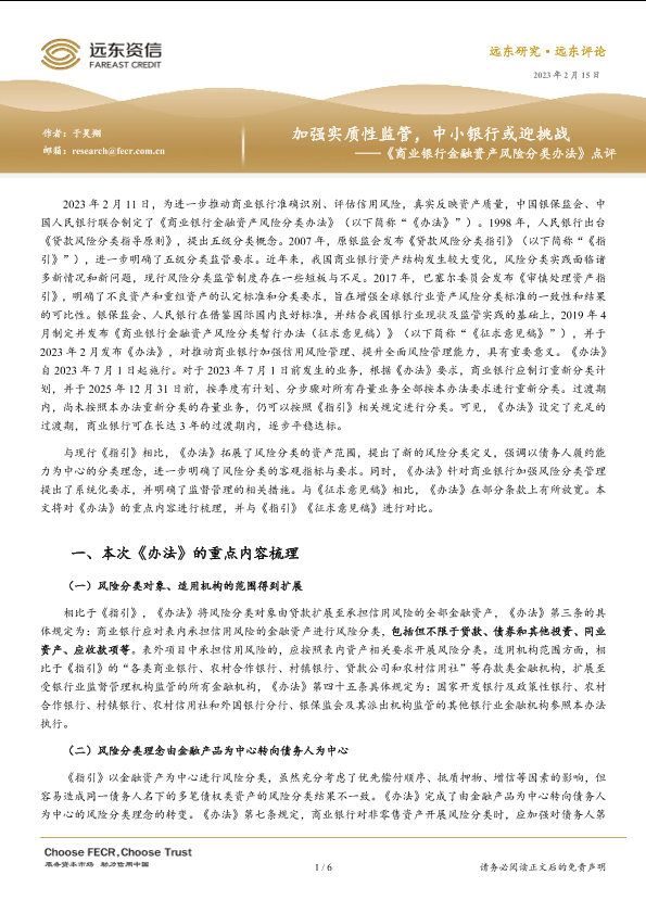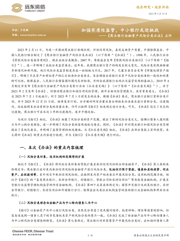 【远东资信】【20230215】加强实质性监管,中小银行或迎挑战 ——《商业银行金融资产风险分类办法》点评-6页