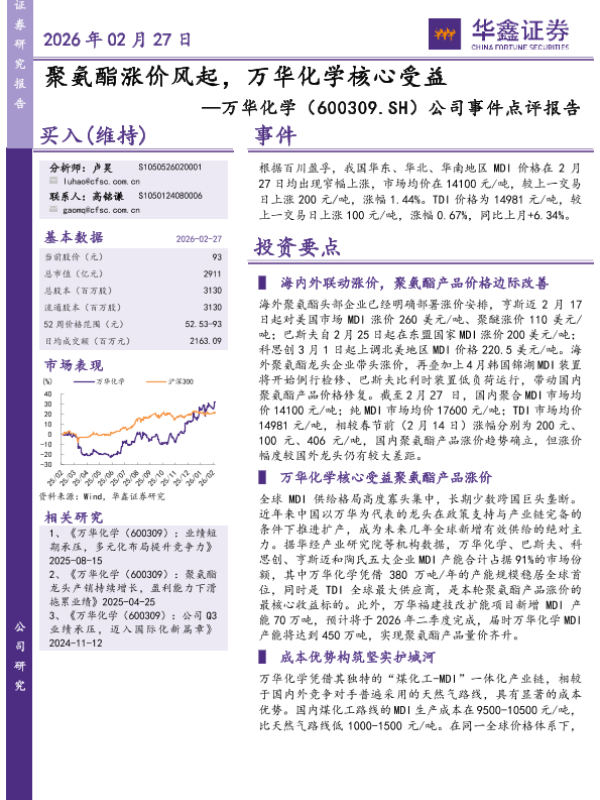 【华鑫证券】【202602】聚氨酯涨价风起,万华化学核心受益-5页