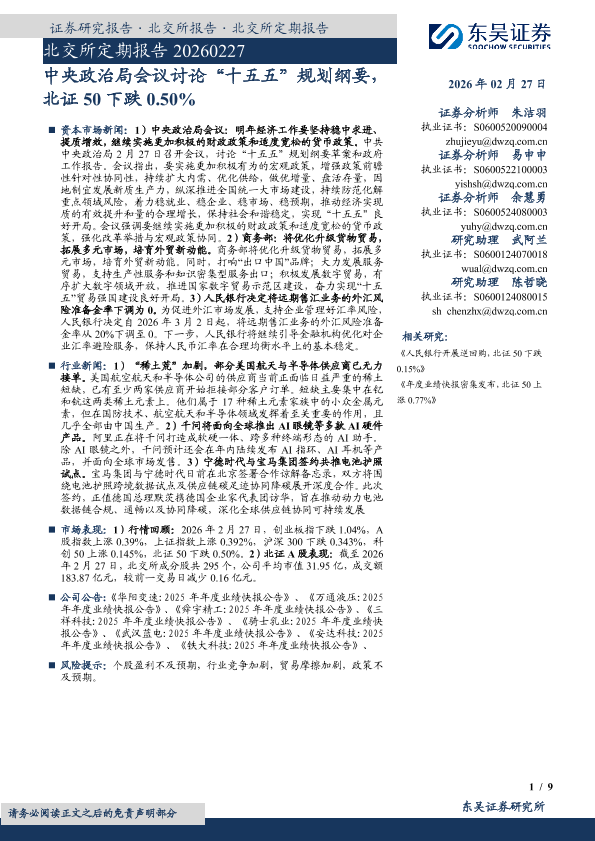 【东吴证券】【202602】中央政治局会议讨论“十五五”规划纲要,北证50下跌0.50%-9页