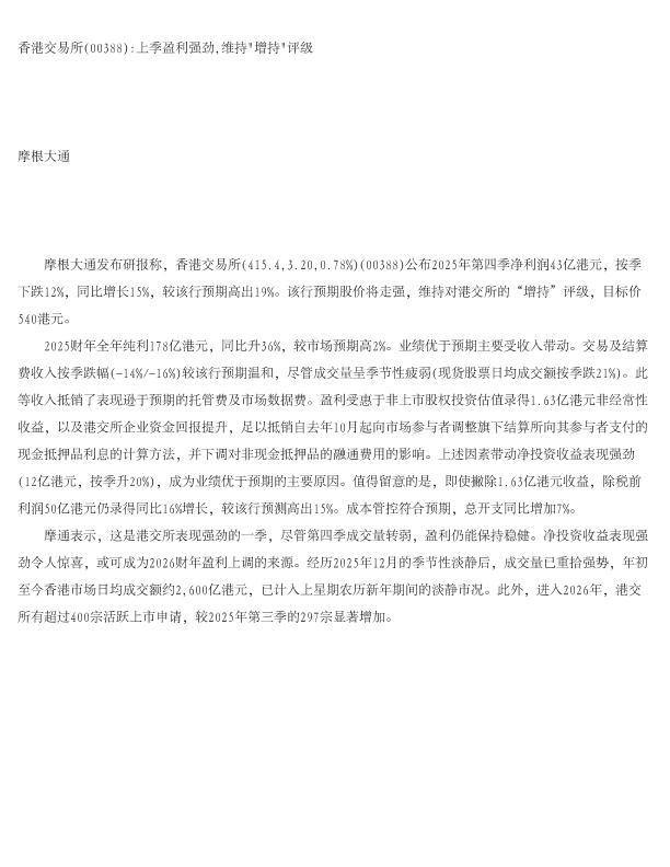 【J.P. Morgan】【2025】香港交易所(00388) 上季盈利强劲,维持"增持"评级-1页