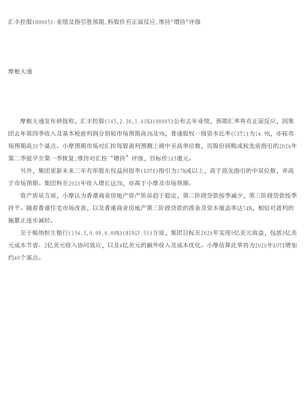 【J.P. Morgan】【2026】汇丰控股(00005) 业绩及指引胜预期,料股价有正面反应,维持"增持"评级-1页