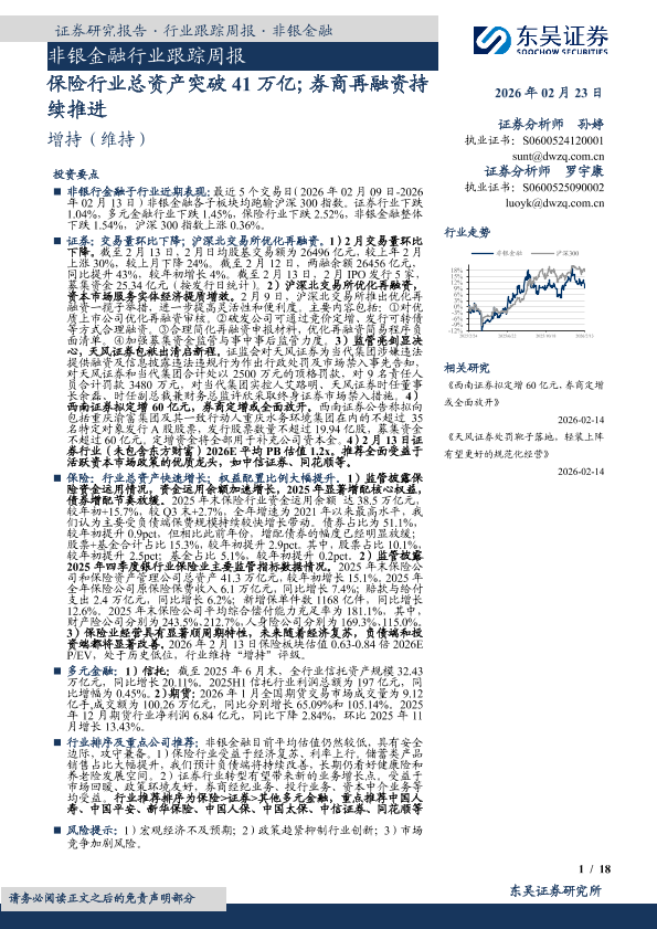 【东吴证券】【202602】保险行业总资产突破41万亿;券商再融资持续推进-18页