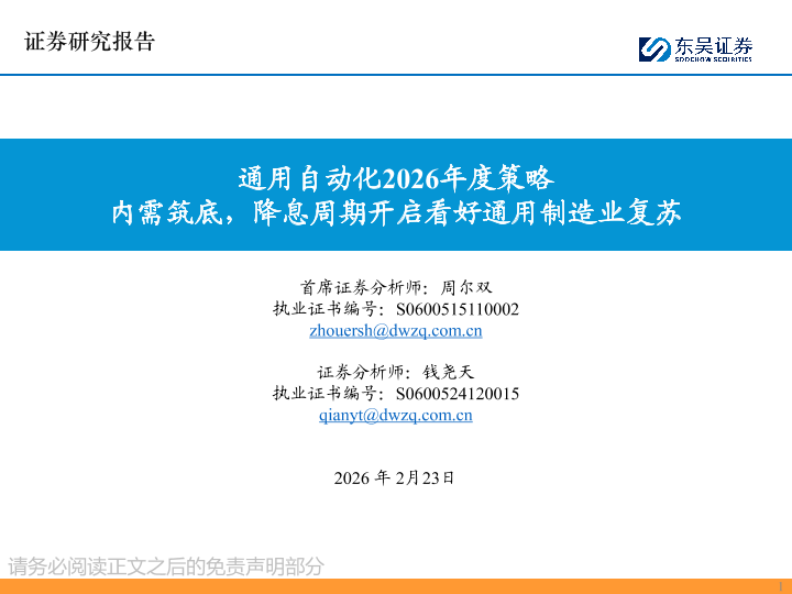 【东吴证券】【202602】通用自动化2026年度策略 内需筑底,降息周期开启看好通用制造业复苏-29页