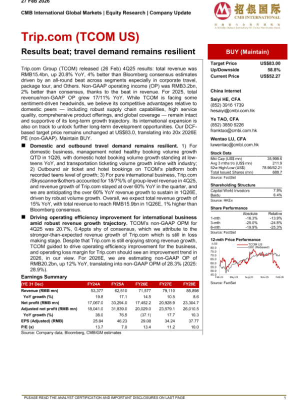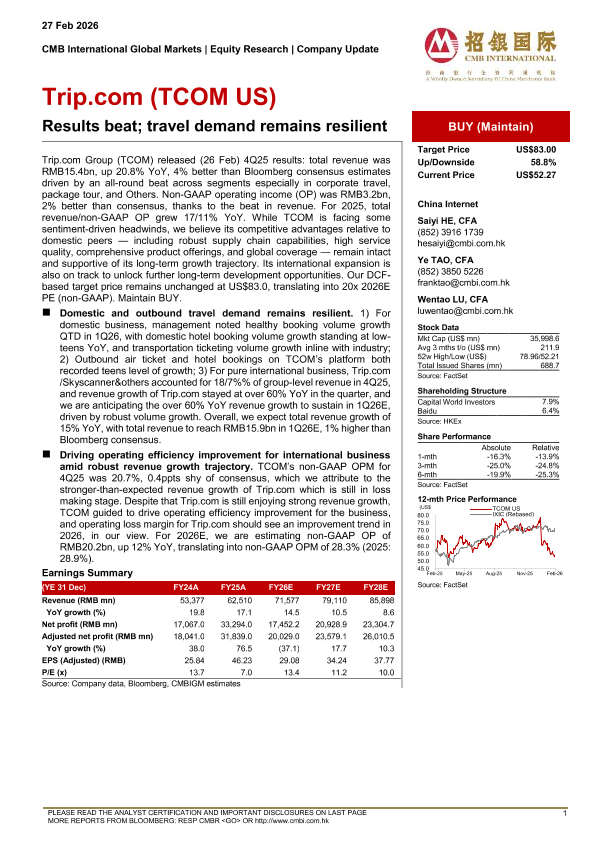 【CMB International Global Markets】【202602】Trip.com(TCOM US)- Results beat; travel demand remains resilient-6页