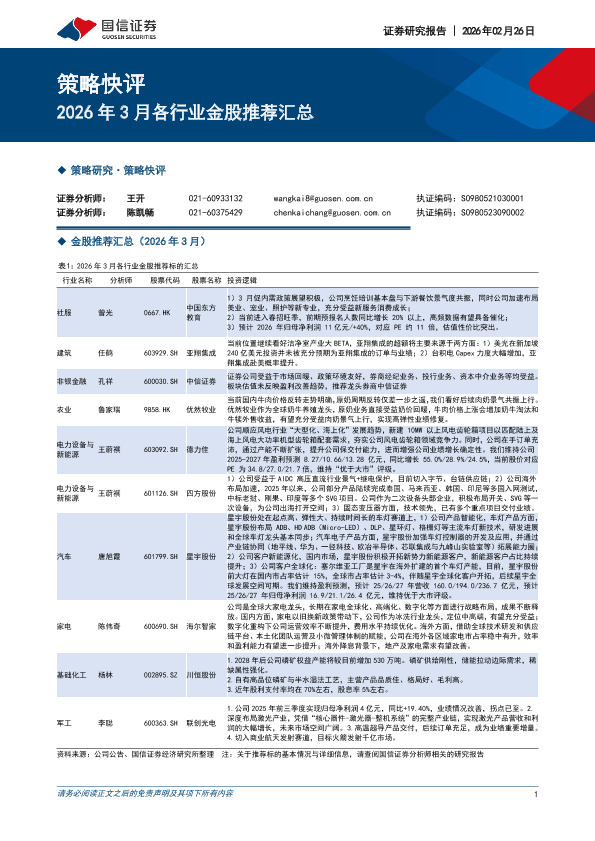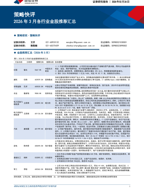 【国信证券】【202603】2026年 3月各行业金股推荐汇总-4页