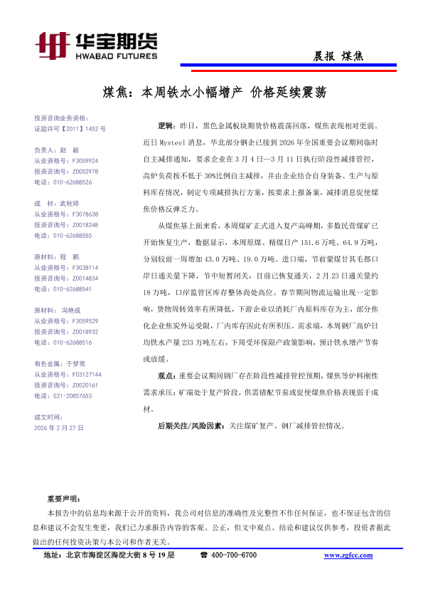 【华宝期货】【202602】煤焦_本周铁水小幅增产_价格延续震荡-1页