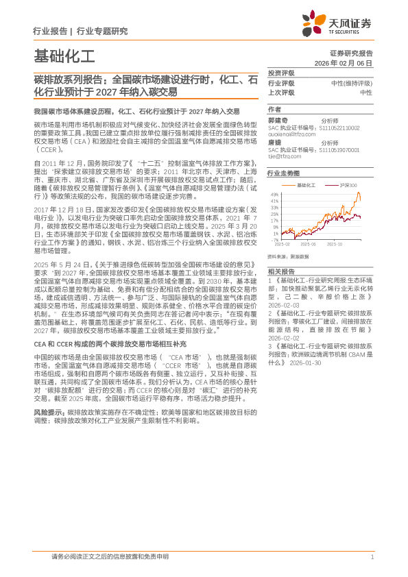 【天风证券】【202602】基础化工行业碳排放系列报告:全国碳市场建设进行时,化工、石化行业预计于2027年纳入碳交易-10页