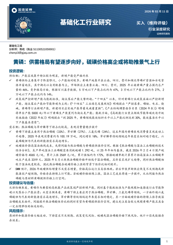 【国金证券】【202602】黄磷:供需格局有望逐步向好,硫磺价格高企或将助推景气上行-16页
