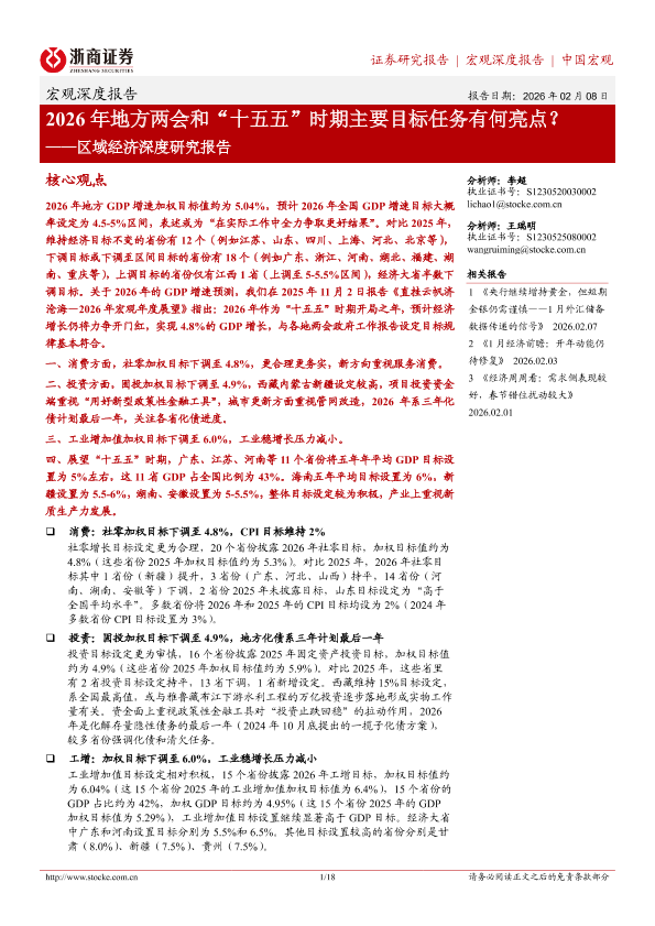 【浙商证券】【202602】2026年地方两会和“十五五”时期主要目标任务有何亮点?——区域经济深度研究报告-18页