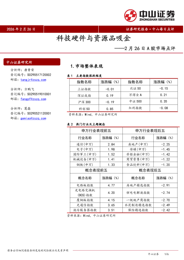 【中山证券】【202602】科技硬件与资源品吸金——2月26日 A股市场点评-6页