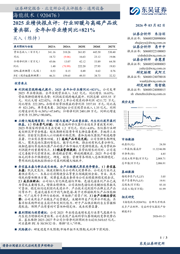 【东吴证券】【202603】2025业绩快报点评:行业回暖与高端产品放量共驱,全年扣非业绩同比+821%-3页