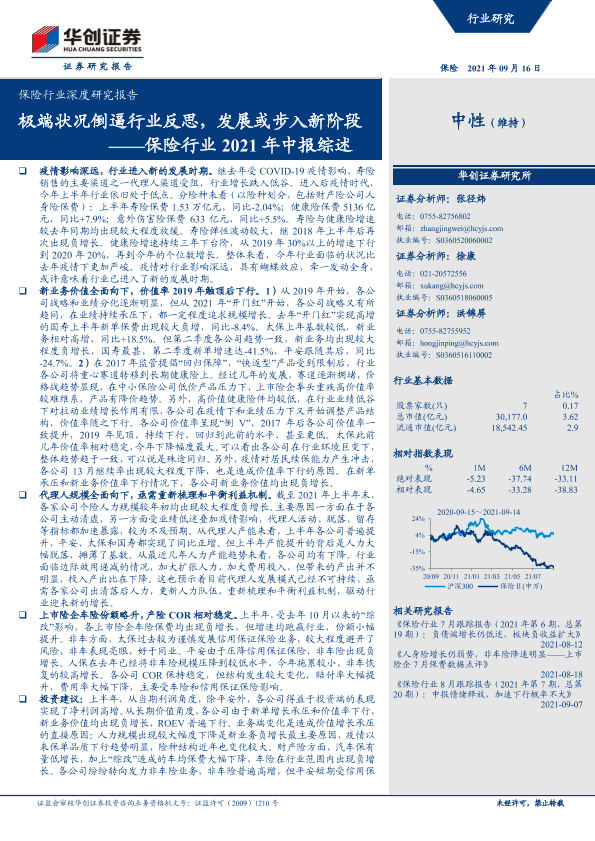 【华创证券】【20210916】保险行业2021年中报综述:极端状况倒逼行业反思,发展或步入新阶段-31页