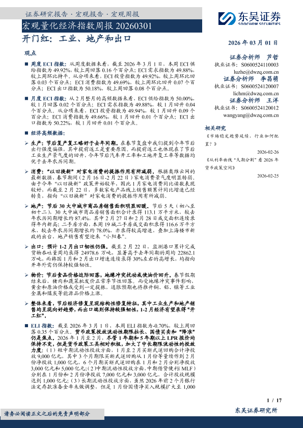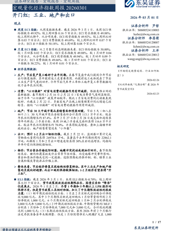 【东吴证券】【202603】宏观量化经济指数周报 20260301 开门红:工业、地产和出口-17页