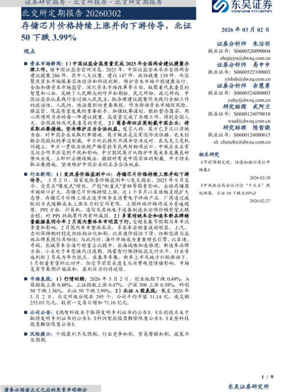 【东吴证券】【202603】存储芯片价格持续上涨并向下游传导,北证50下跌3.99%-9页
