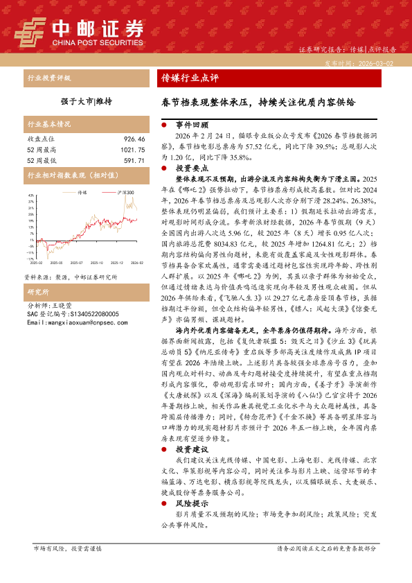 【中邮证券】【202603】传媒行业点评:春节档表现整体承压,持续关注优质内容供给-3页