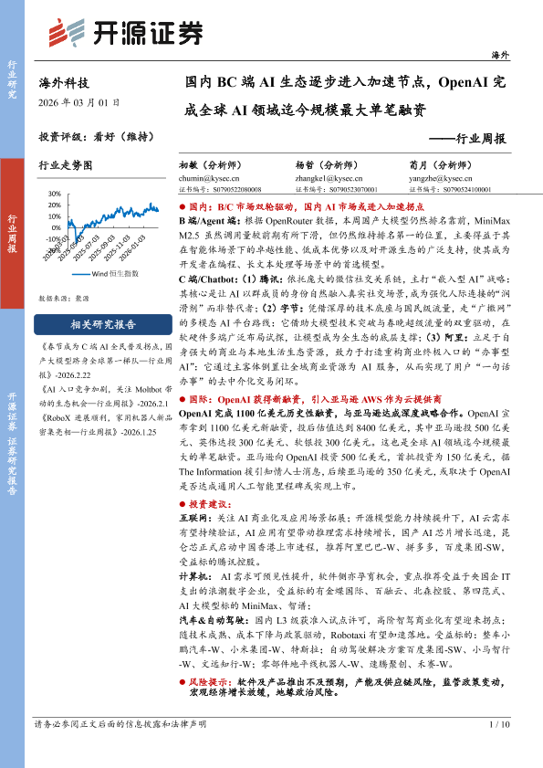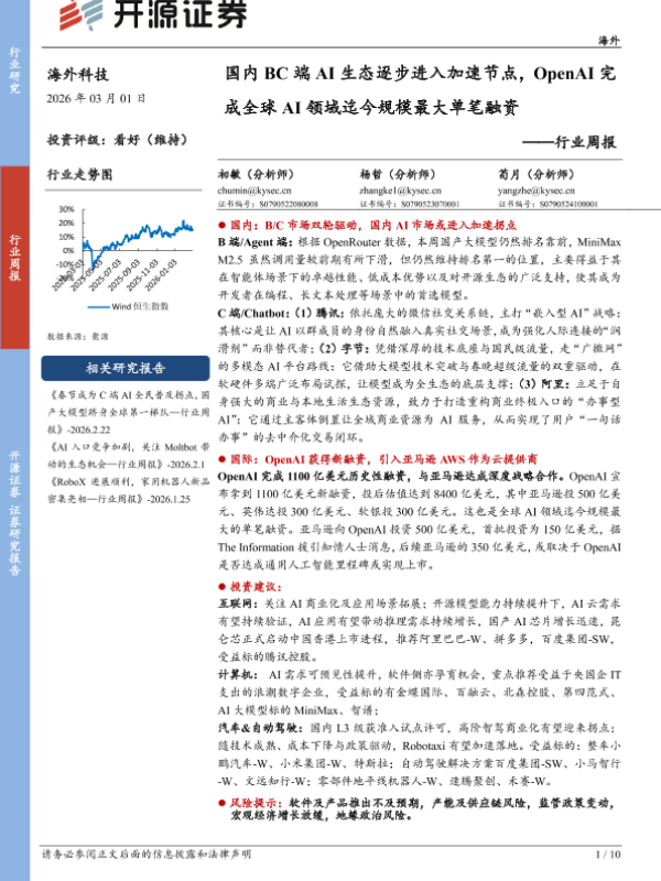 【开源证券】【202603】海外科技行业周报:国内BC端AI生态逐步进入加速节点,OpenAI完成全球AI领域迄今规模最大单笔融资-10页