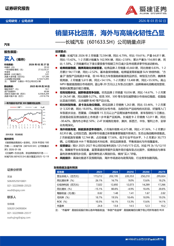 【爱建证券】【202601】销量环比回落,海外与高端化韧性凸显——长城汽车(601633.SH)公司销量点评-3页