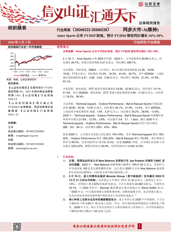 纺织服装 运动品牌 Amer Sports 财报分析 行业周报