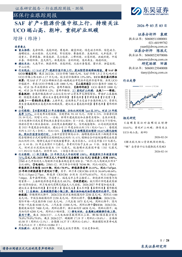 【东吴证券】【202603】环保行业跟踪周报:SAF扩产+能源价值中枢上行,持续关注UCO端山高、朗坤,重视矿业双碳-28页
