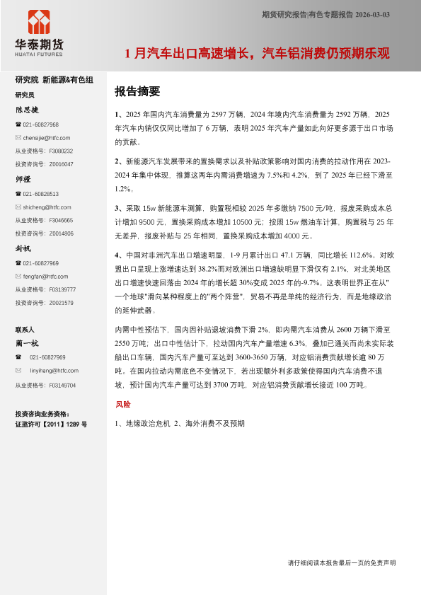 【华泰期货】【2025】2026年汽车出口高速增长_汽车铝消费仍预期乐观-10页