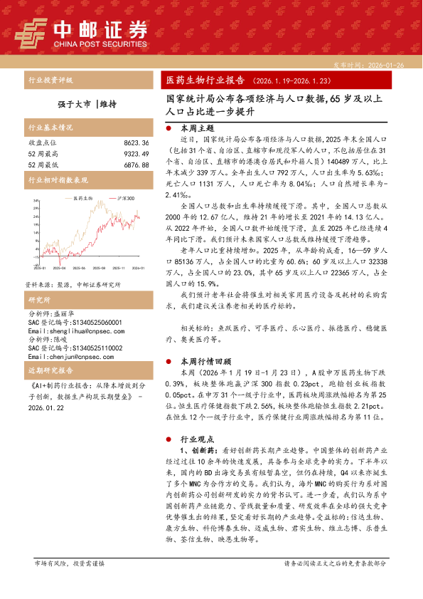 【中邮证券】【202601】医药生物行业:国家统计局公布各项经济与人口数据,65岁及以上人口占比进一步提升-17页