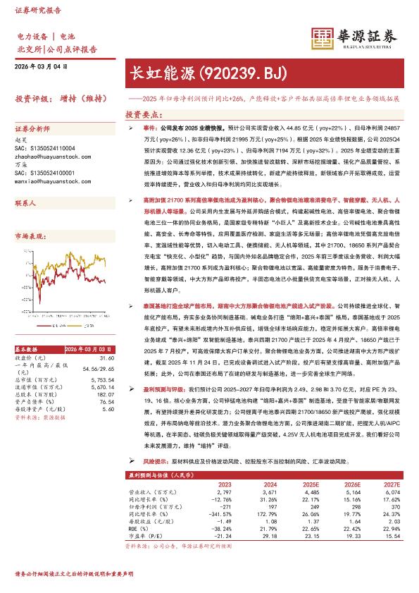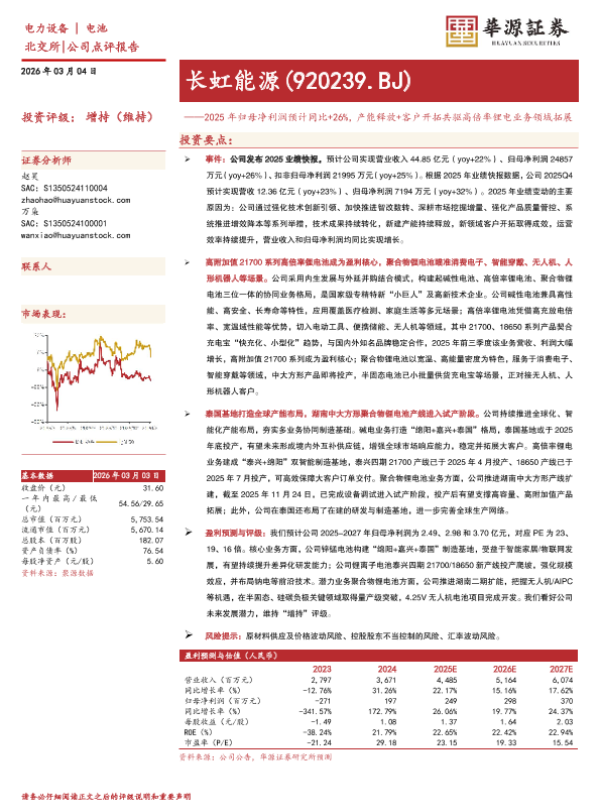 【华源证券】【202603】2025年归母净利润预计同比+26%,产能释放+客户开拓共驱高倍率锂电业务领域拓展-3页