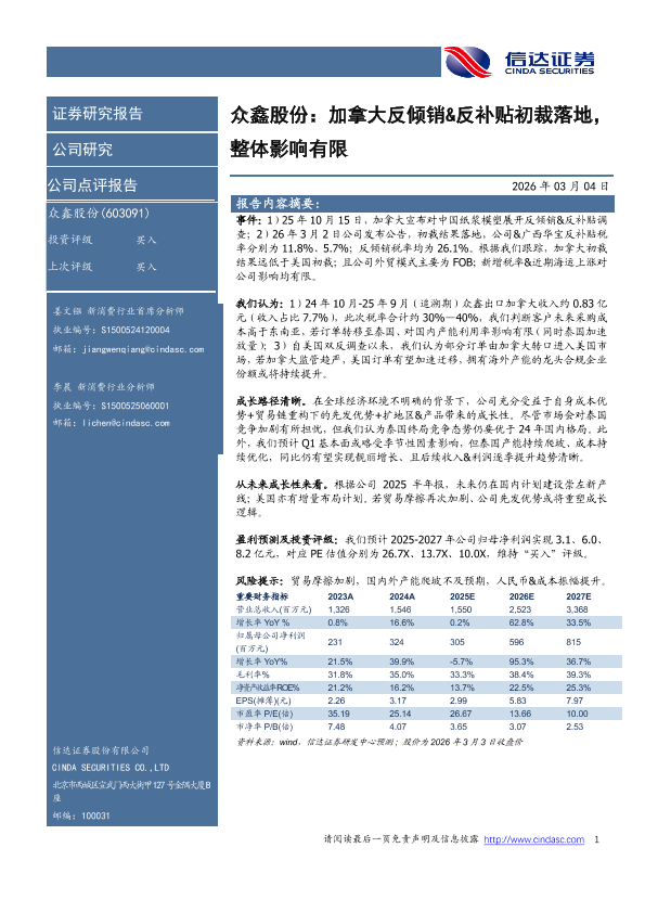 【信达证券股份有限公司 C INDA SECUR IT IES CO.<D】【202603】众鑫股份:加拿大反倾销&反补贴初裁落地,整体影响有限-4页