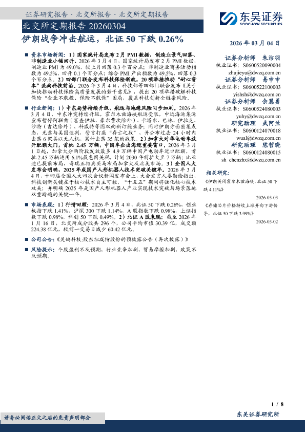 【东吴证券】【202603】伊朗战争冲击航运,北证 50下跌 0.26%-8页