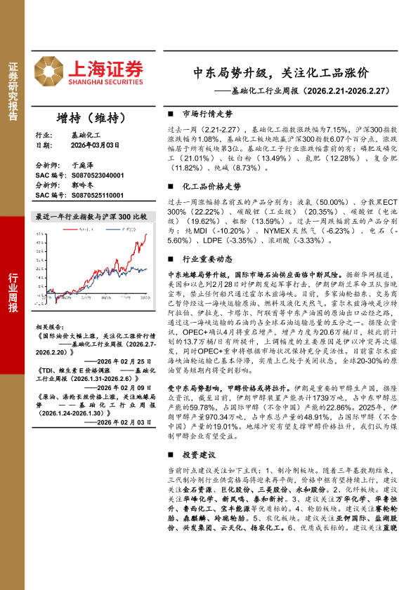 【上海证券】【202603】基础化工行业周报:中东局势升级,关注化工品涨价-10页