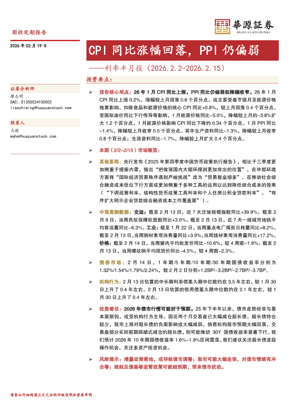 【华源证券】【202602】CP I同比涨幅回落,PP I仍偏弱——利率半月报(2026.2.2-2026.2.15)-20页