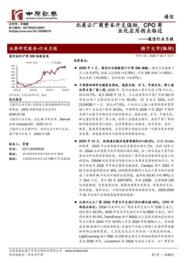 【中原证券】【202602】通信行业月报:北美云厂商资本开支强劲,CPO商业化应用拐点临近-46页