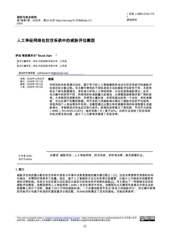 【哈吉&巴亚拉姆&韦利大学经济计量学系】【2026】人工神经网络在防空系统中的威胁评估模型-21页