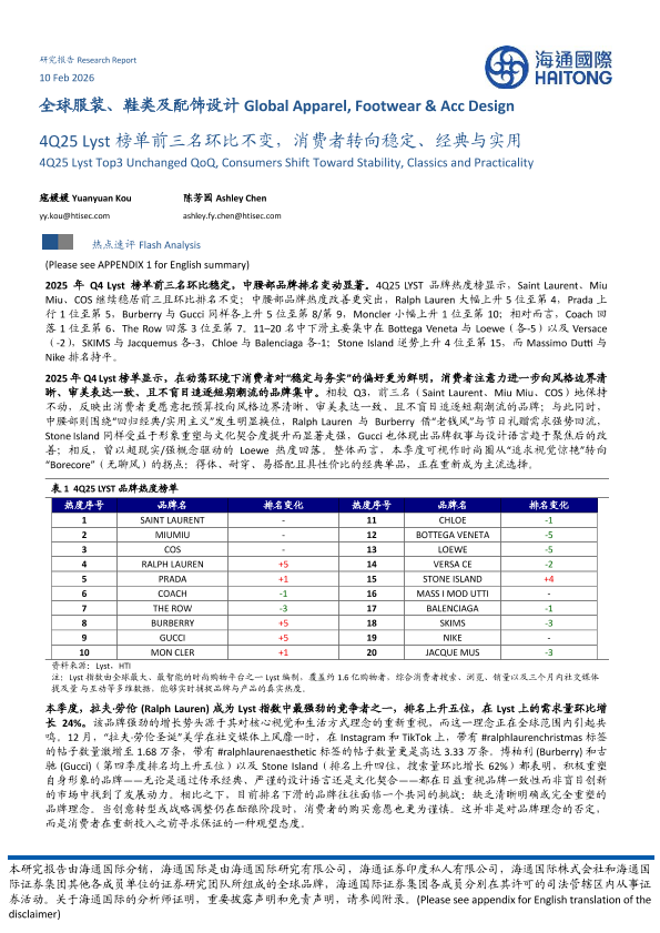 【海通国际】【202602】全球服装、鞋类及配饰设计行业:4Q25+Lyst榜单前三名环比不变,消费者转向稳定、经典与实用-10页