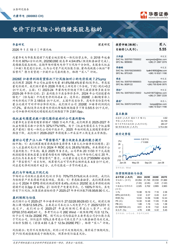 内蒙华电 高股息 煤电一体化 盈利预测 电价风险