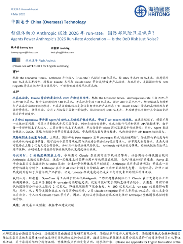 【海通国际】【202603】智能体助力 Anthropic提速 2026年 run-rate,国防部风险只是噪声?-9页