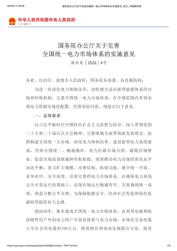 【国务院办公厅】【2026】国务院办公厅关于完善全国统一电力市场体系的实施意见-8页