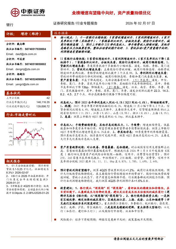【中泰证券】【202602】银行业:前瞻|上市银行2025年年报,业绩增速有望稳中向好,资产质量持续优化-10页