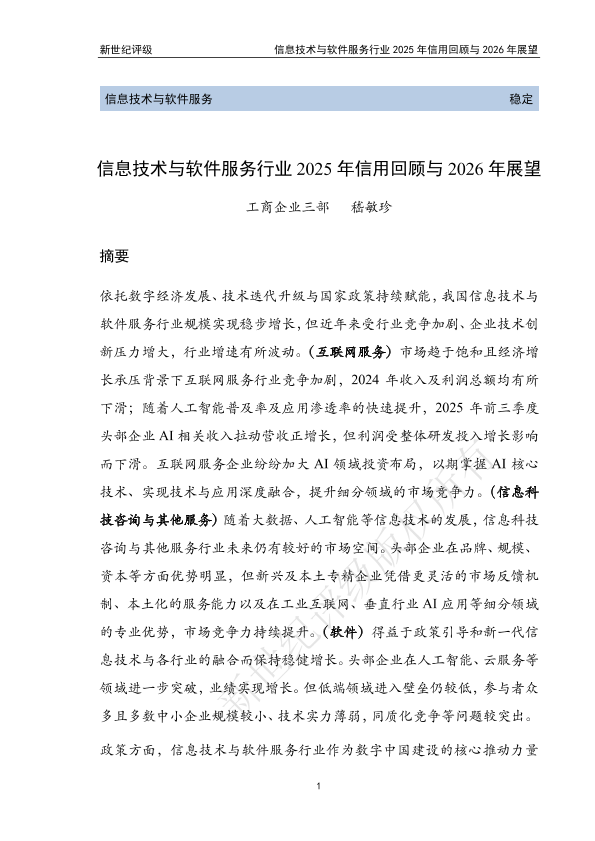 【新世纪评级】【2025】信息技术与软件服务行业2025年信用回顾与2026年展望-56页