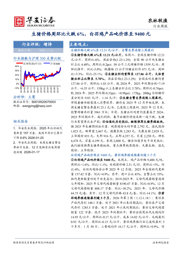 【华安证券】【202601】生猪价格周环比大跌6%,白羽鸡产品吨价涨至9400元-38页